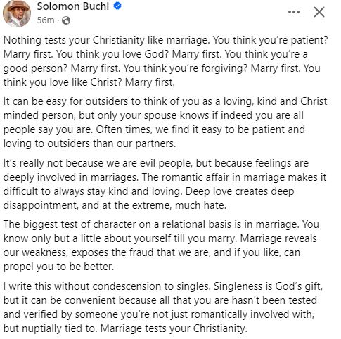 Popular Nigerian author and life coach, Solomon Buchi has opined that the greatest test for a Christian is marriage.
