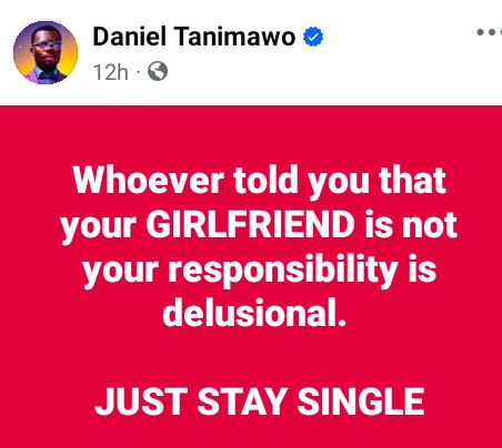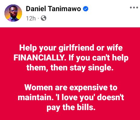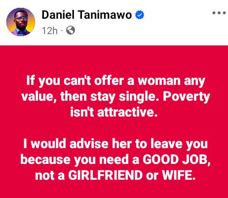 A US-based Nigerian man, Daniel Tanimawo, has urged men to stay single if they cannot financially care for their girlfriends or wives.