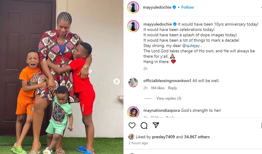 May Edochie has taken to Instagram to pen a note to Awele, the late wife of Jnr Pope on what would have been their 10th wedding anniversary today, July 26.