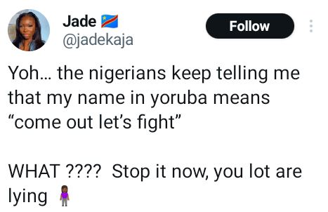 “Yoh… the Nigerians keep telling me that my name in Yoruba means “come out let’s fight” WHAT ???? Stop it now, you lot are lying,” she tweeted on Thursday.