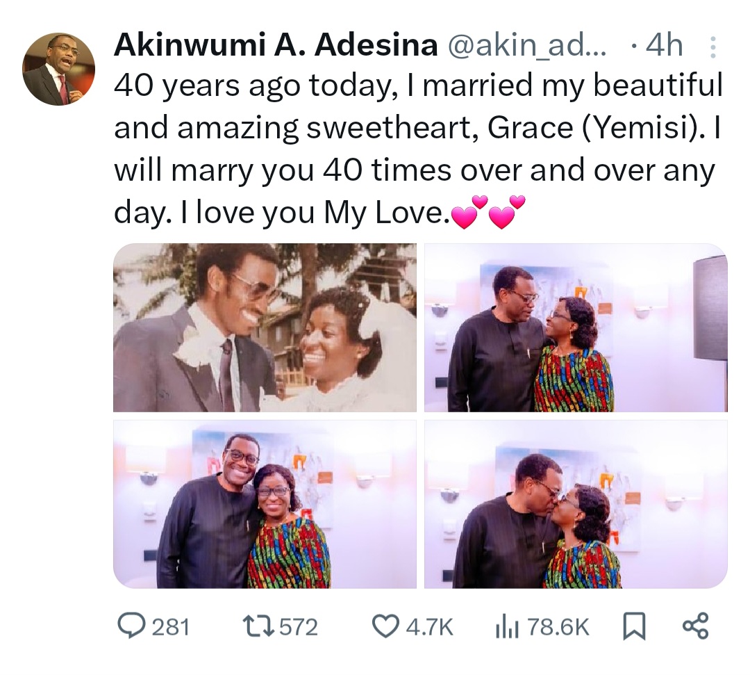 In the caption on X, he wrote: “40 years of loving and treasuring you, Grace (Yemisi) are the best years of my life.