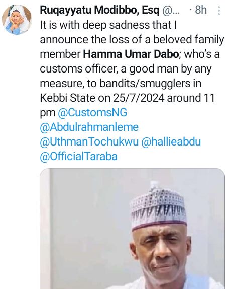 The Nigeria Customs Service patrol base in Koko, Kebbi State, was invaded by gunmen, leading to the death of an officer, Dabo Umar, and the abduction of one other.