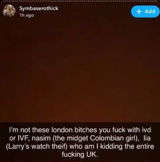 “I’m not these London b*tches you f*ck with ivd or IVF, nasim (the midget Colombian girl), lia (Larry’s watch thief) who am I kidding the entire fucking UK. Just run my coin before this turns all the way LEFT,” she wrote.