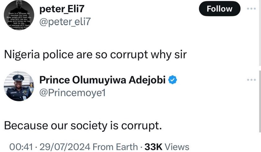Adejobi said this while responding to a question from an X user who wondered why the police in Nigeria are corrupt.