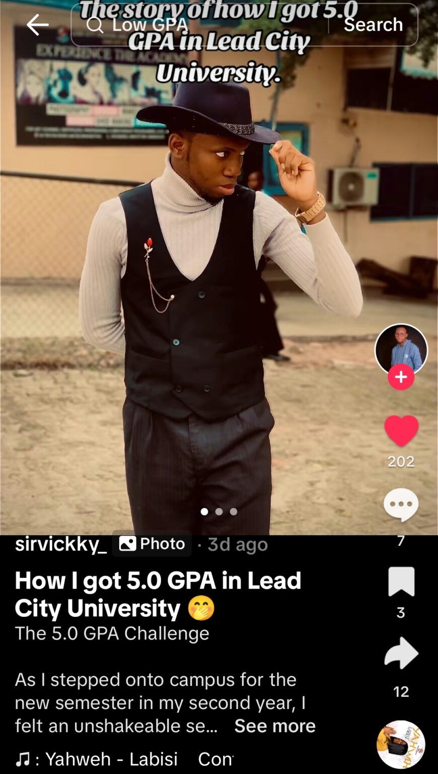 A post about his academic success read: “How I Got a 5.0 GPA at Lead City University 🤭 The 5.0 GPA Challenge.”
