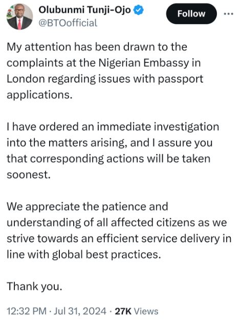 On Wednesday morning, July 31, Nigerian nationals living in the United Kingdom gathered at the country's High Commission in London to protest the prolonged delay in issuing their international passports.