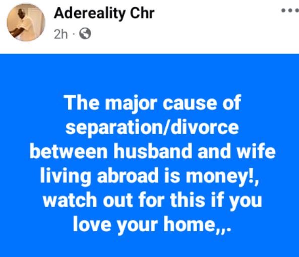 “The major cause of separation/divorce between husband and wife living abroad is money!, watch out for this if you love your home,” he wrote in a post on Thursday.