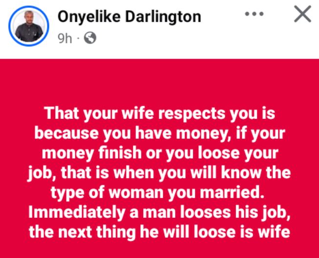 “That your wife respects you is because you have money, if your money finish or you loose your job, that is when you will know the type of woman you married. Immediately a man looses his job, the next thing he will loose is wife,” he wrote in a post on Thursday.