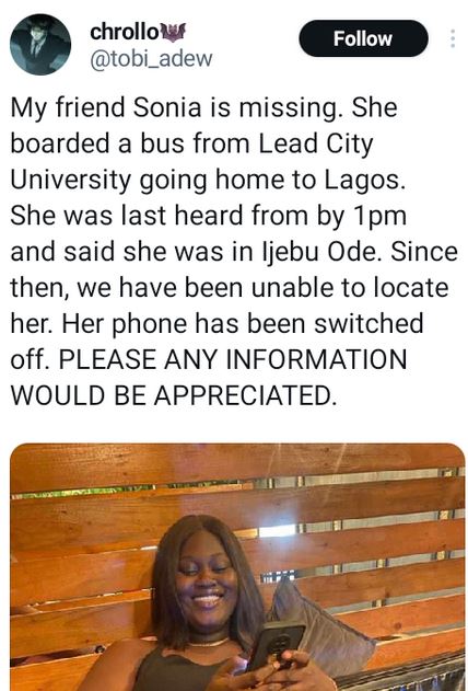 “My friend Sonia is missing. She boarded a bus from Lead City University going home to Lagos. She was last heard from by 1pm and said she was in Ijebu Ode. Since then, we have been unable to locate her. Her phone has been switched off. PLEASE ANY INFORMATION WOULD BE APPRECIATED.” she wrote on X