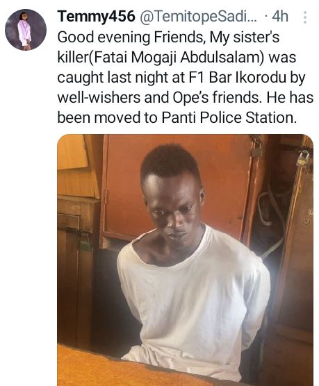 “Good evening Friends, My sister's killer (Fatai Mogaji Abdulsalam) was caught last night at F1 Bar Ikorodu by well-wishers and Ope’s friends. He has been moved to Panti Police Station,” she wrote.