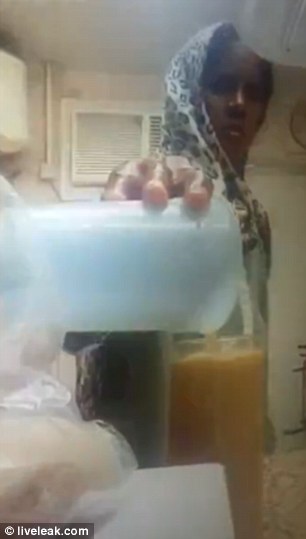 The camera captured two women going about their daily chores while one of them prepared a drink. She is seen stirring it and then heading away before the second maid walks over to the juice. She quickly pulled out beaker of what purportedly contains her own urine from her trousers. She is then clearly seen topping up the drink with the liquid.
