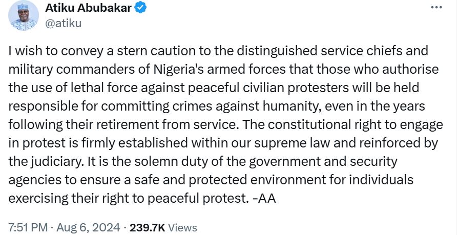 “I wish to convey a stern caution to the distinguished service chiefs and military commanders of Nigeria's armed forces that those who authorise the use of lethal force against peaceful civilian protesters will be held responsible for committing crimes against humanity, even in the years following their retirement from service. The constitutional right to engage in protest is firmly established within our supreme law and reinforced by the judiciary. It is the solemn duty of the government and security agencies to ensure a safe and protected environment for individuals exercising their right to peaceful protest. -AA”.