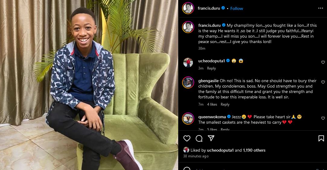 Veteran Nollywood actor, Francis Duru has been left bereaved over the demise of his son, Ifeanyi.