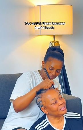 A Nigerian man has shared a heartwarming video of his wife plaiting his mother's hair.