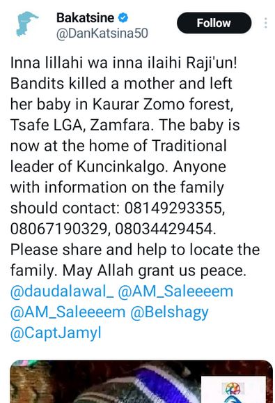 The bandits killed theoman and left her baby in Kaurar Zomo forest in Tsafe Local Government Area of Zamfara.