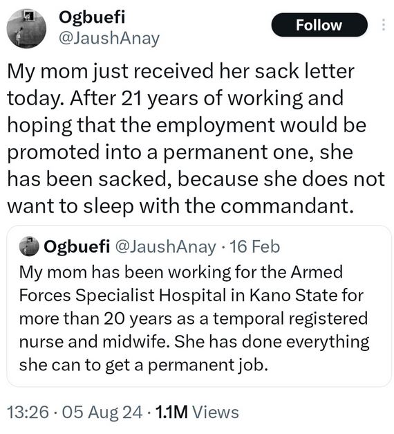 He wrote: "My mom just received her sack letter today. After 21 years of working and hoping that the employment would be promoted into a permanent one, she has been sacked, because she does not want to sleep with the commandant."