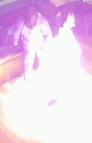 The individual douses the shop with an accelerant, using a lighter to set fire to it. Flames engulf the store, and the arsonist is set on fire, forcing him to make a quick exit.