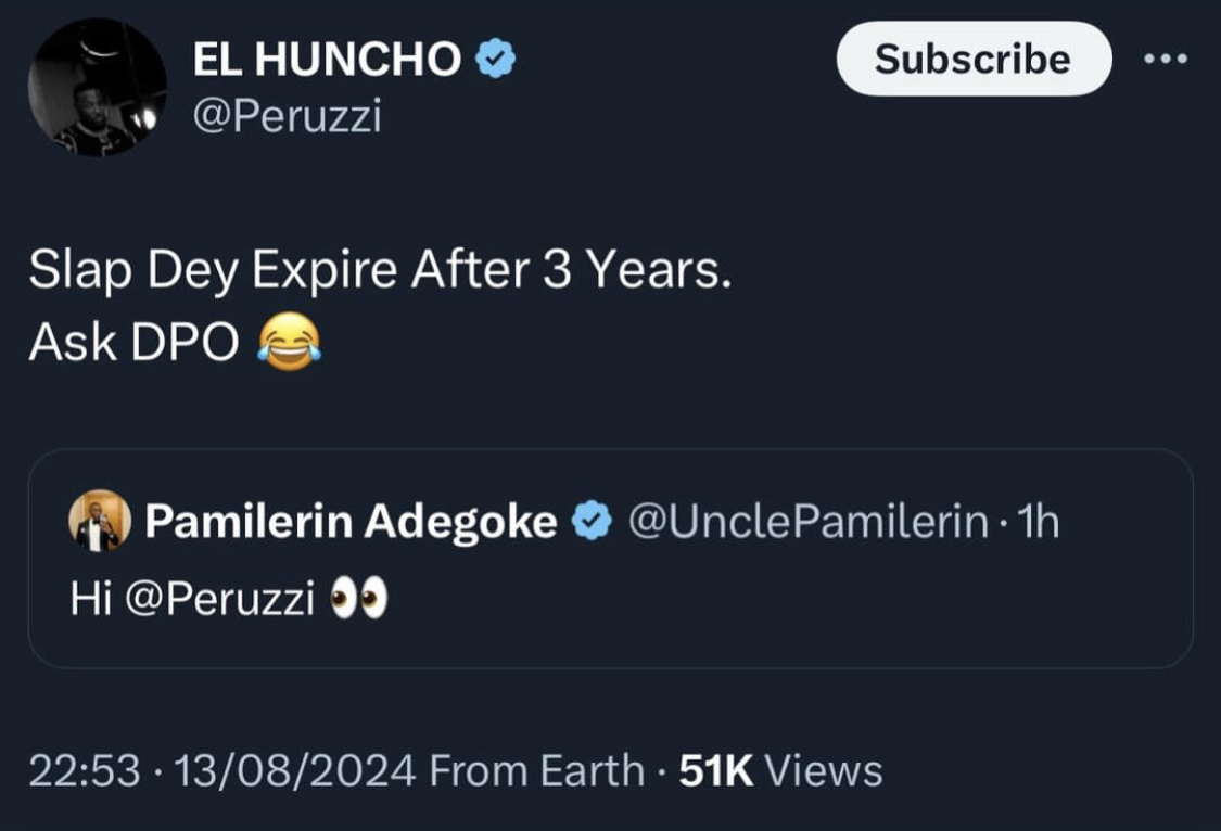 Slap Dey Expire After 3 Years – Peruzzi Warns Influencer Pamilerin Not to Drag Him While Referencing Their 2019 Fight