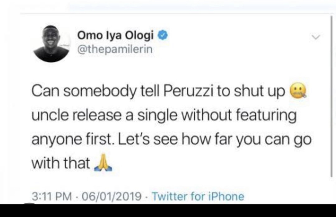Just yesterday, Pamilerin sent Peruzzi ‘Hi’ on Twitter, and without wasting time, the singer reminded him of their past history.