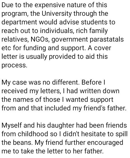 Due to the expensive nature of this program, the University through the department would advise students to reach out to individuals, rich family relatives, NGOs, government parastatals etc for funding and support. A cover letter is usually provided to aid this process.