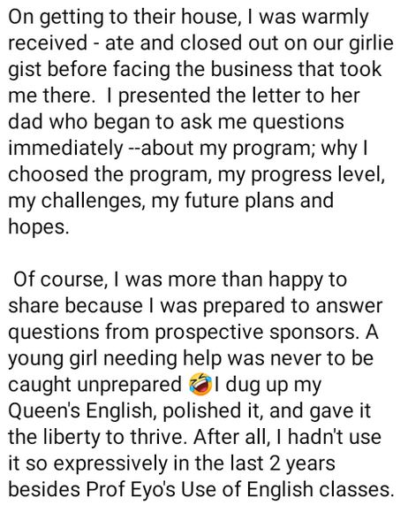 On getting to their house, I was warmly received - ate and closed out on our girlie gist before facing the business that took me there. I presented the letter to her dad who began to ask me questions immediately --about my program; why I choose the program, my progress level, my challenges, my future plans and hopes.
