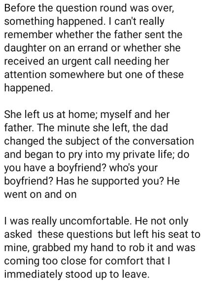 She left us at home; myself and her father. The minute she left, the dad changed the subject of the conversation and began to pry into my private life; do you have a boyfriend? who's your boyfriend? Has he supported you? He went on and on