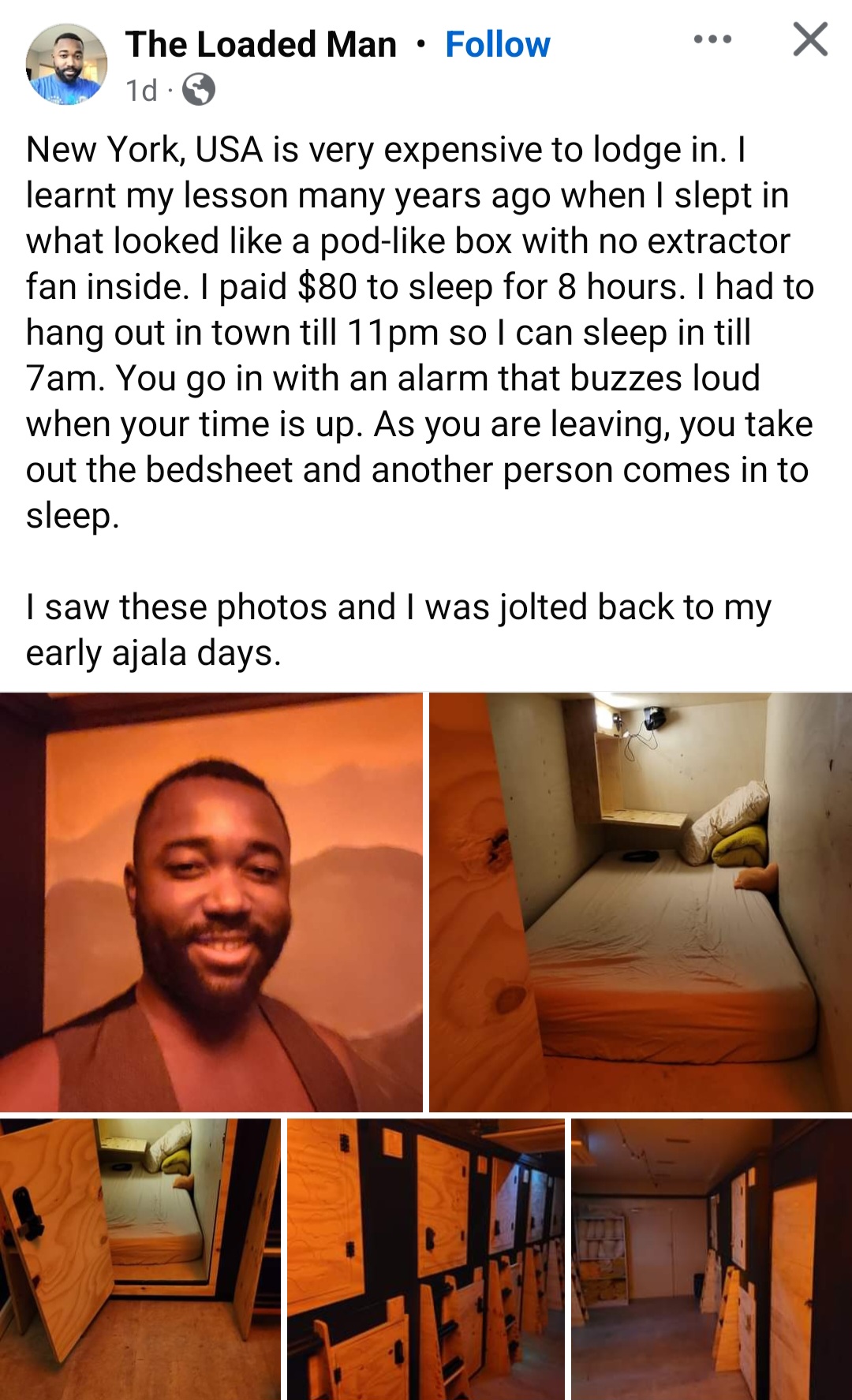 He revealed that many years ago, he had to pay $80 to sleep in a "pod-like box" for 8 hours per day.