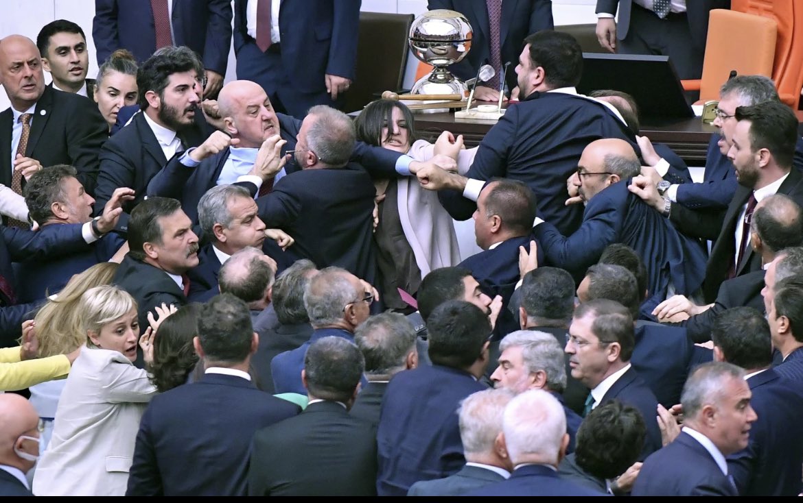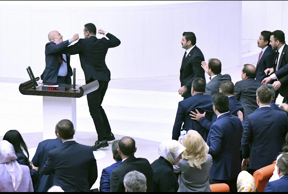 AP reports that a chaotic scene unfolded in the Turkish Grand National Assembly during a recent session, with multiple deputies involved in a scuffle.