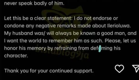 "I beg you, with all that you hold dear, not to tarnish his memory. Disrespecting Ilerioluwa in his death is showing disdain for his entire family. Anyone who truly loved him would never speak badly of him," Wunmi stated.