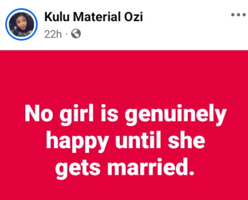 A Nigerian lady, Kulu Ozi, has given her opinion on marriage and what it means to single ladies.