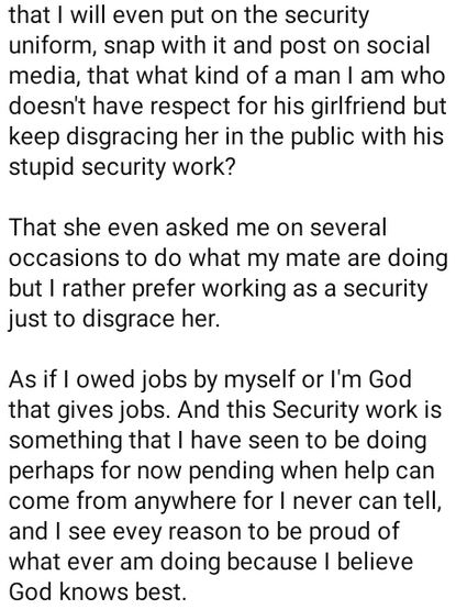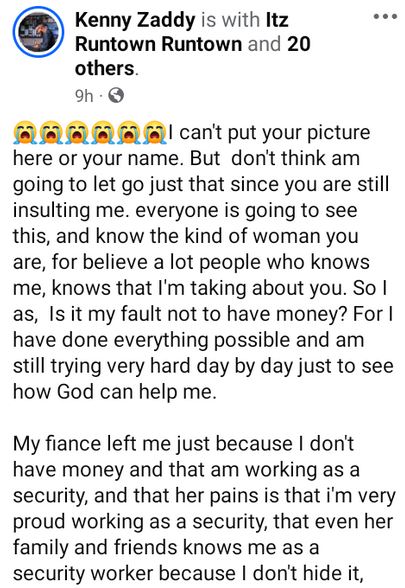 My fiancé left me just because I don't have money and that am working as a security, and that her pains is that I'm very proud working as a security, that even her family and friends knows me as a security worker because I don't hide it, that I will even put on the security uniform, snap with it and post on social media, that what kind of a man I am who doesn't have respect for his girlfriend but keep disgracing her in the public with his stupid security work?