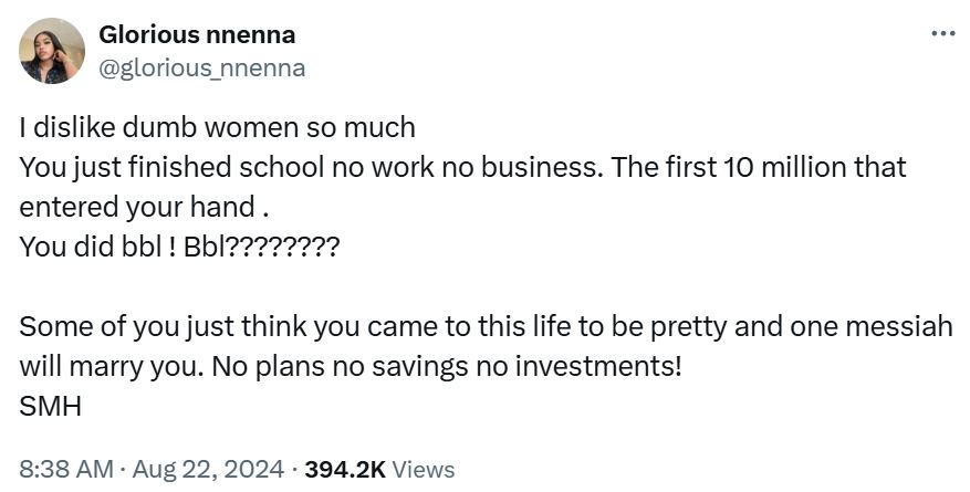 In the viral post, @glorious_nnenna wrote: "I dislike dumb women so much. You just finished school, no work, no business. The first 10 million that entered your hand, you did BBL! BBL???????"
