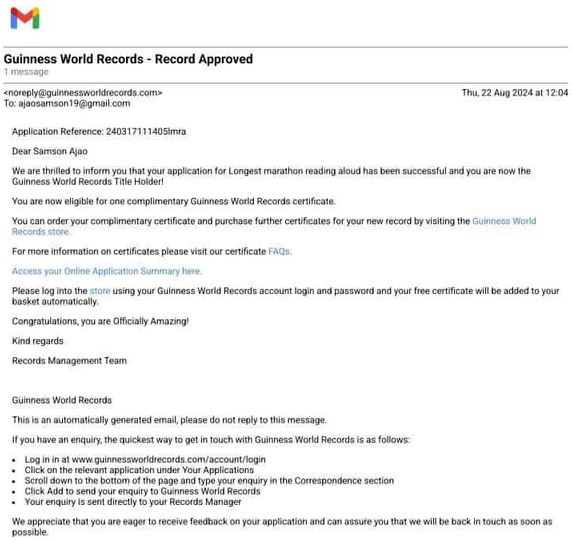 Ajao Samson, a Nigerian man from Osun State, has been confirmed as the new world record title holder for the longest marathon read aloud by the Guinness World Record, GWR.