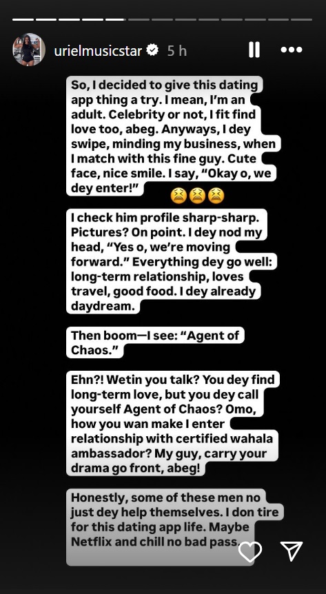 Uriel humorously recounted her reaction, questioning how someone who claims to seek long-term love could label themselves with such a title. "My guy, carry your drama go front, abeg!" she wrote, expressing her reluctance to engage with someone who openly embraced chaos.
