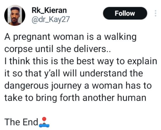 A Nigerian medical doctor, Kieran, has opined that a pregnant woman is a walking corpse until she gives birth.