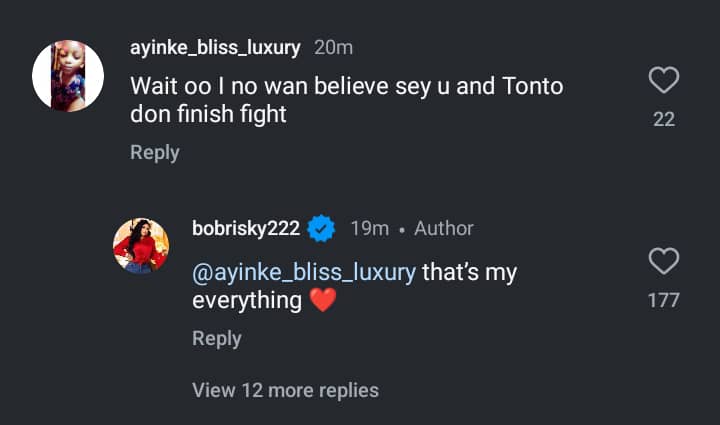 “Wait oo I no wan believe sey u and Tonto Dikeh don finish fight,” the fan asked.