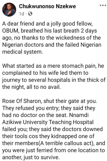 A Nigerian man, Chuwkunonso Nzekwe is heartbroken over the demise of his friend, Obum Mekowulu Oluchukwu, who died three days ago after he was allegedly rejected by several hospitals in Anambra after doctors embarked on strike.