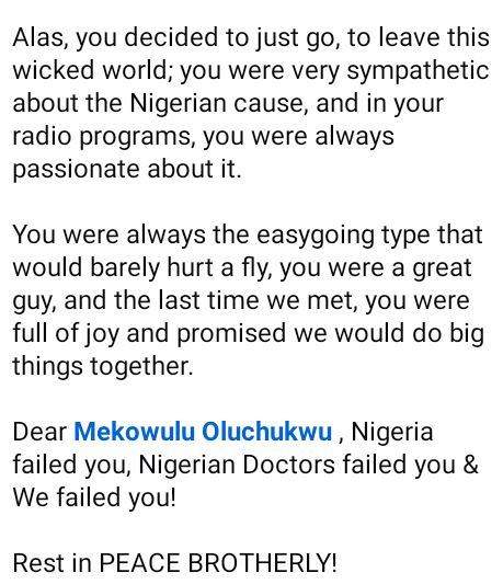 “Dear Mekowulu Oluchukwu, Nigeria failed you, Nigerian Doctors failed you & We failed you! Rest in PEACE BROTHERLY.”