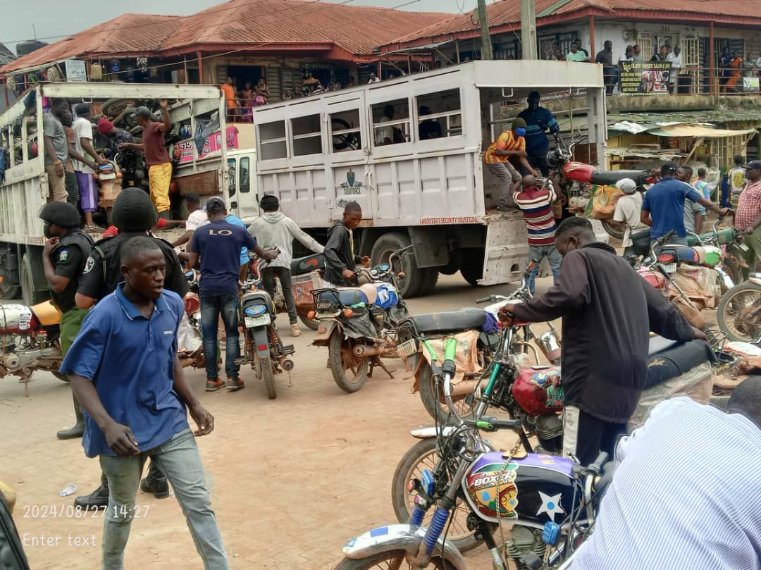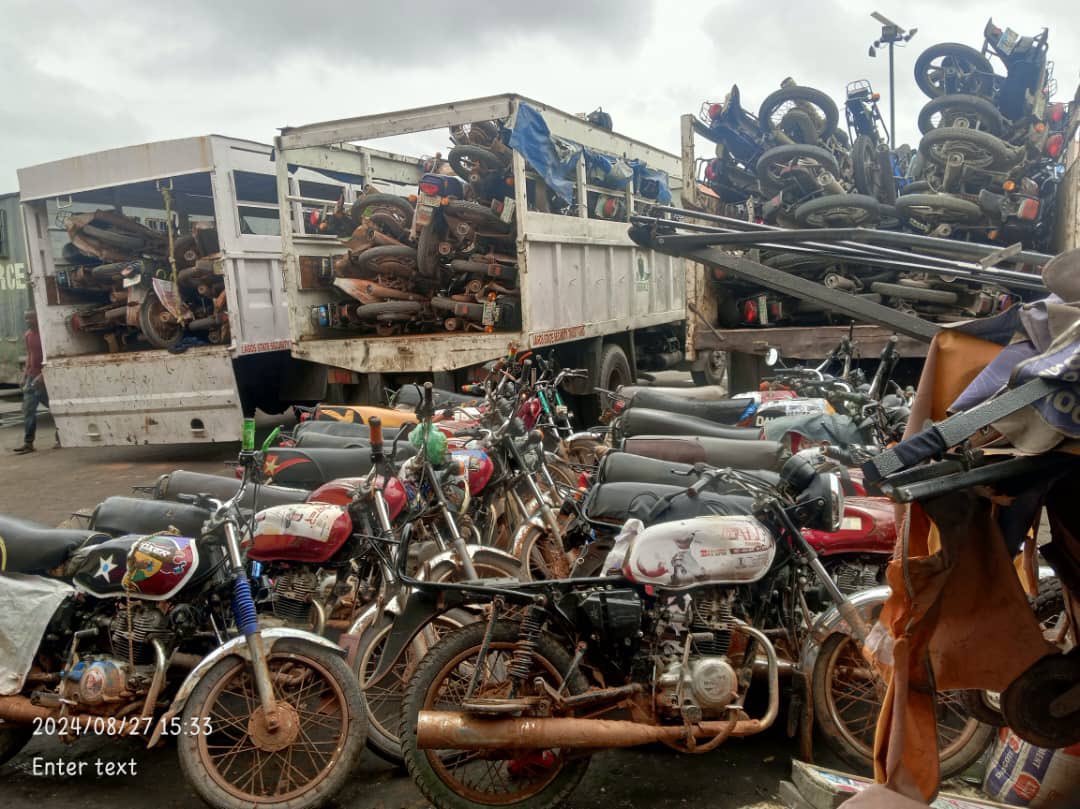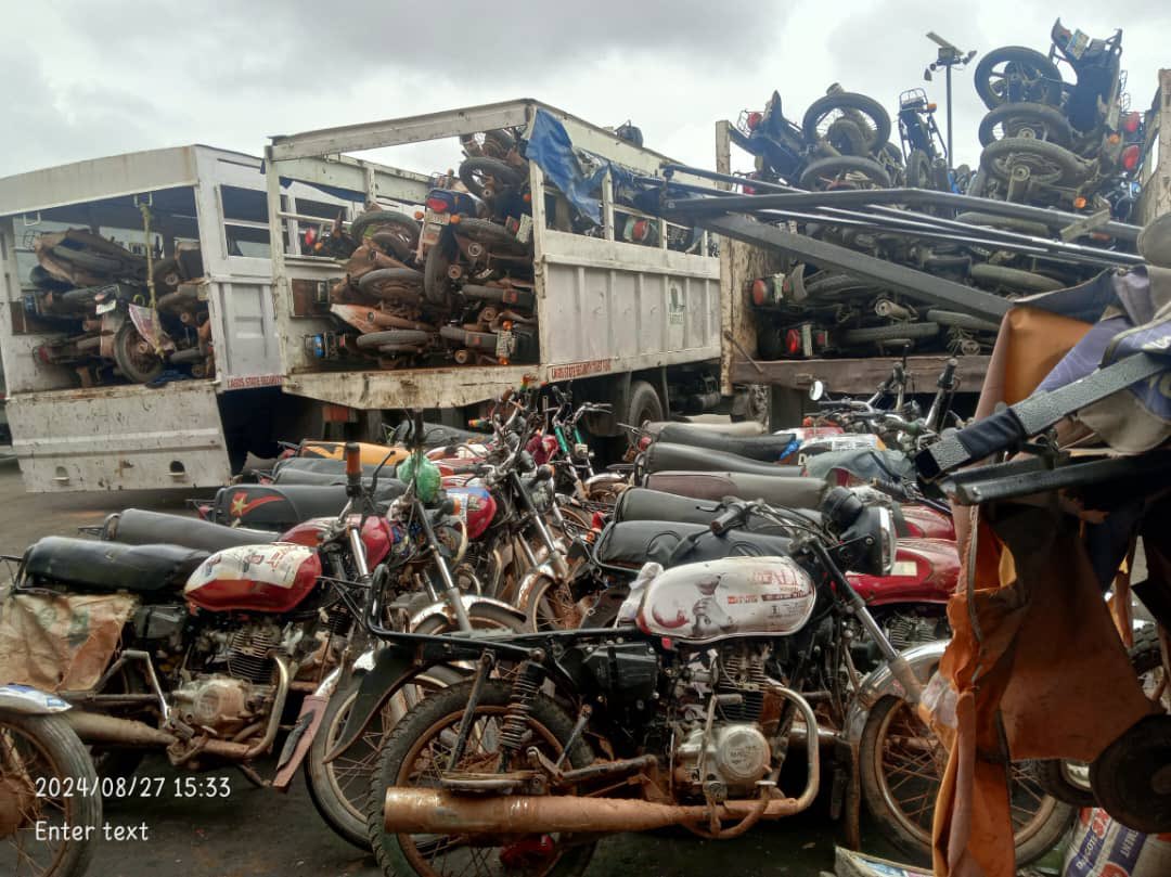 During enforcement operations, Lagos State Task Force operatives seized 106 motorcycles at various locations, including Iyana-School bus stop, First Gate bus stop near Igbo-Elerin, Iyana Iba-LASU Expressway, Megida bus stop, and Ayobo roundabout.