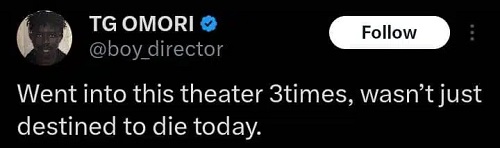 In his words: “Will be up soon. I promise. Went into this theater 3times, wasn’t just destined to die today.”
