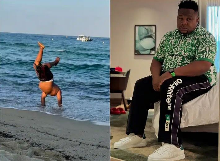 Cubana Chief Priest, the famous Nigerian businessman, has caused quite a stir online after showing off his acrobatic skills while spending quality time at the beach.