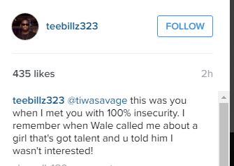 He wrote, “@tiwasavage this was you when I met you with 100% insecurity. I remember when Wale called me about a girl that’s got talent and u told him I wasn’t interested!