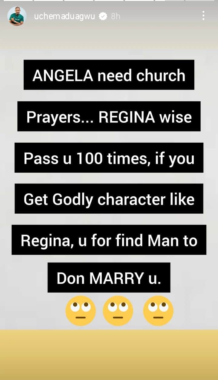 Uche wrote: “Angela needs church prayers. Regina wise pass you 100 times, if you get Godly character like Regina, u for find man to don marry u”.