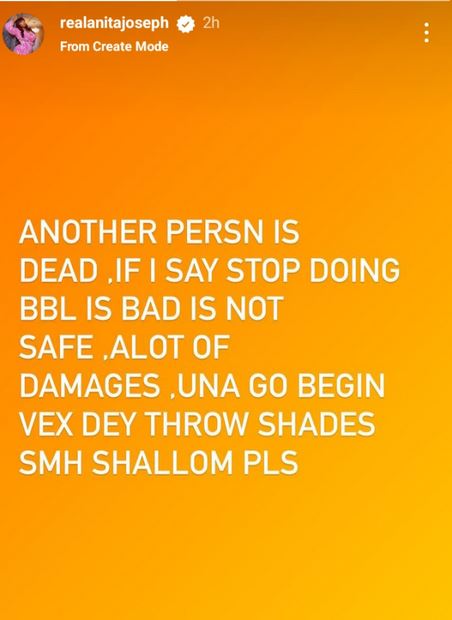 Popular Nigerian actress, Anita Joseph has reacted to news of a lady who died after undergoing a butt enlargement procedure.