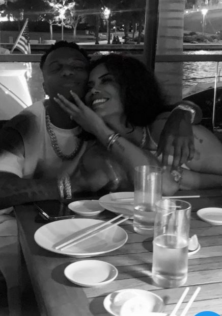 In the picture, Wizkid and Jada are at a fancy restaurant. Jada is leaning on Wizkid’s shoulder and gently holding his chin. They are both smiling, with Wizkid giving Jada a tender hug.