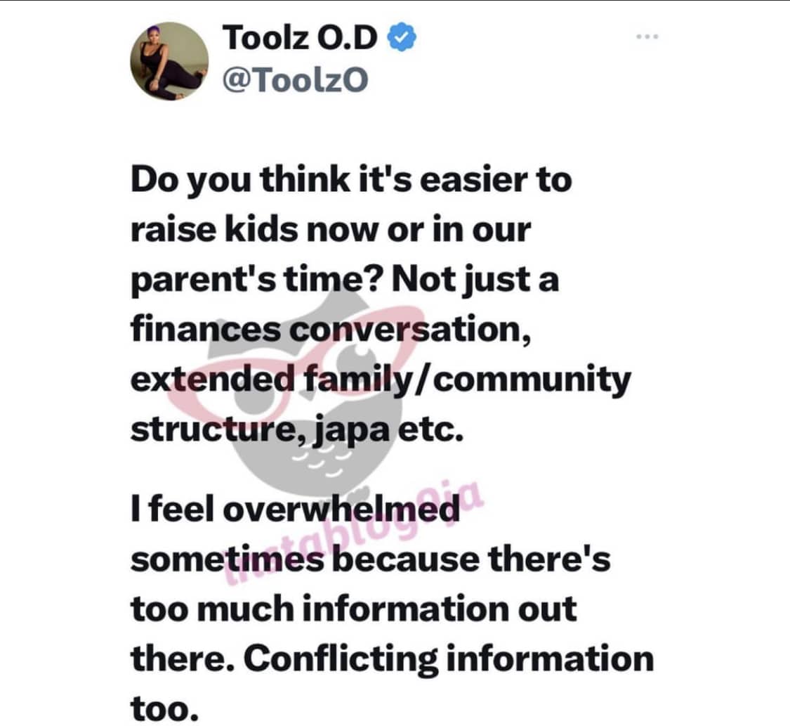 Her post read: “Do you think it’s easier to raise kids now or in our parent’s time? Not just a finances conversation, extended family/community structure, japa etc.”