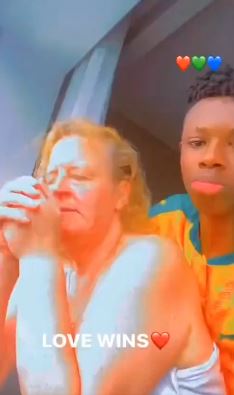 A young man has stirred mixed reactions online after he shared a loved-up video with his older Caucasian lover.