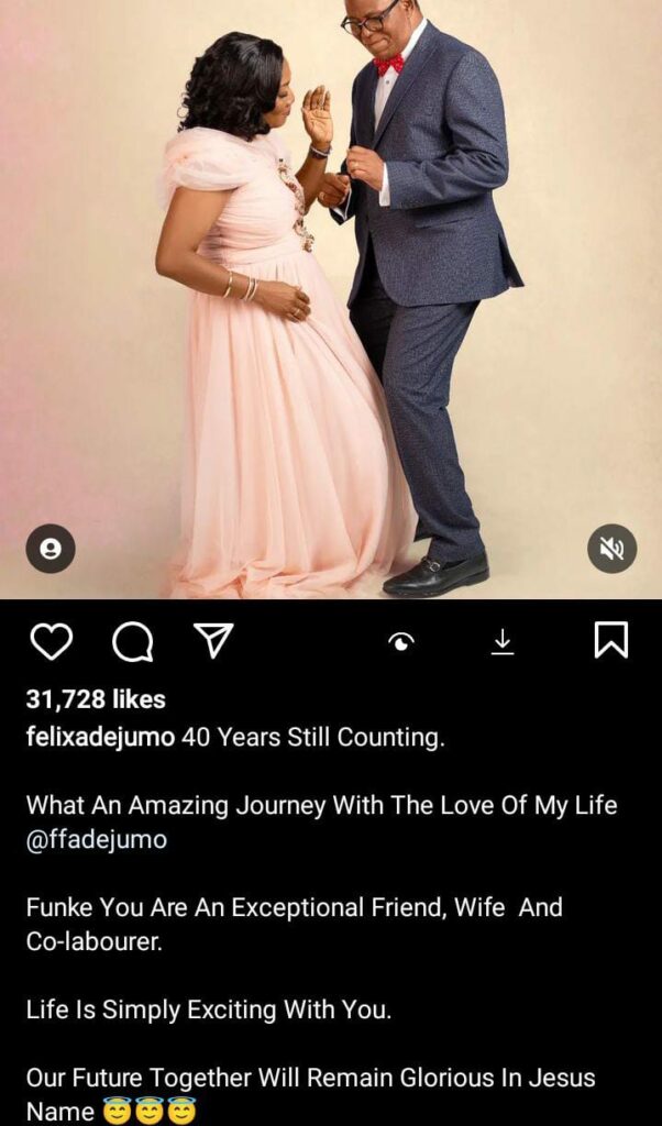 He wrote: “40 Years Still Counting. What An Amazing Journey With The Love Of My Life @ffadejumo. Funke You Are An Exceptional Friend, Wife And Co-labourer. Life Is Simply Exciting With You. Our Future Together Will Remain Glorious In Jesus Name 😇😇😇”
