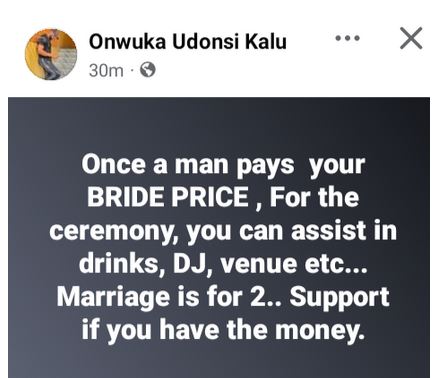 She disclosed this on Friday, September 13, while reacting to a post by a Facebook user, Onwuka Kalu, advising women to assist their men financially during weddings after they pay the bride price.