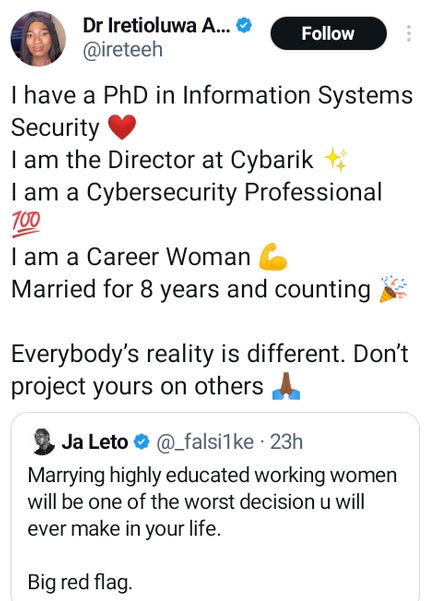 A career Nigerian woman, Iretioluwa Akerele, has slammed a supposed life coach, after making a controversial claim about highly educated women.